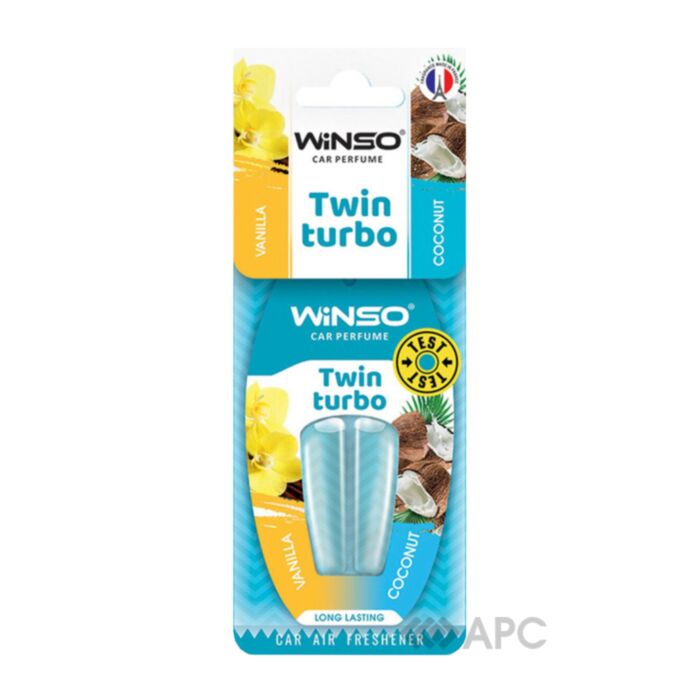 Ароматизатор з подвійною капсулою Winso Twin Turbo 538380 Vanilla & Coconut — це унікальне поєднання кольору, форми та запаху, яке дарує насолоду не лише нюховим відчуттям людини, але і радують око досконалістю відтінків та плавністю ліній. Водій в дорозі може часто відчувати дискомфорт від неприємного запаху, який видають функціональні системи транспорту. І підвішений до дзеркала заднього виду ароматизатор може легко виправити ситуацію, наповнивши простір ненав'язливими, але глибокими та натуральними нотками улюблених фруктів, квітів і масел.