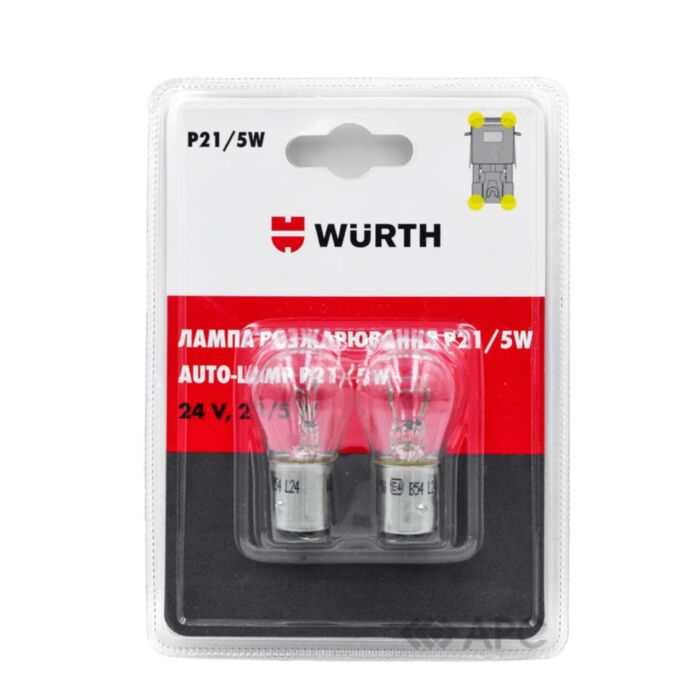 Автолампа розжарювання Wurth 07209342 P21/5W BAY15D 24V 21/5W 2 шт – це надійне джерело світла для задніх ліхтарів вантажних автомобілів та іншої техніки, що працює від напруги 24V. Вона має поширений тип P21/5W з цоколем BAY15D. Лампа оснащена двома нитками розжарення з різною потужністю: 21W для сигналу "стоп" або задніх протитуманних фар, а також 5W для габаритних вогнів. Ця конструкція дозволяє поєднати дві функції в одній лампі. Комплект складається з двох штук, що дозволяє одночасно замінити лампи в обох ліхтарях. Автолампи Wurth виготовлені з якісних матеріалів, стійких до вібрацій та екстремальних температур, що забезпечує їх надійну та довговічну роботу в умовах інтенсивної експлуатації.