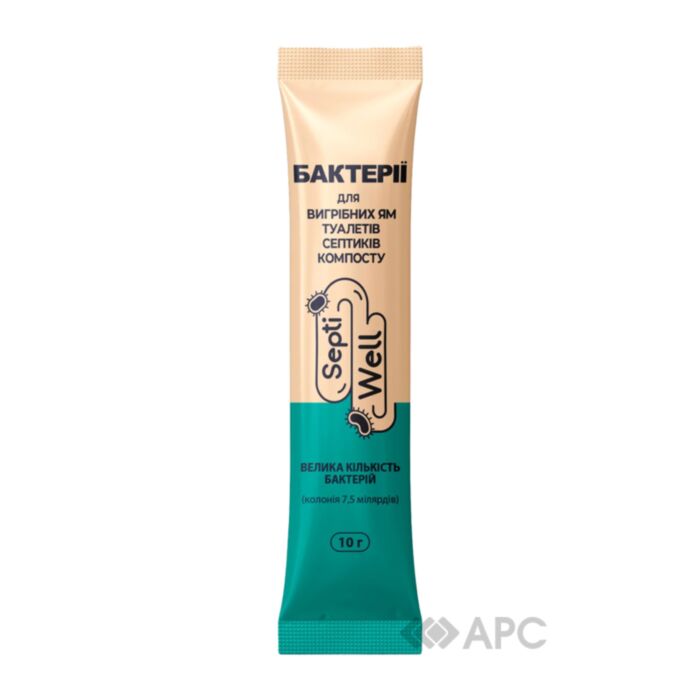 Бактерії Septi Well для септиків 10 г – це ефективний біопрепарат для оптимізації роботи септиків, вигрібних та компостних ям. Висока концентрація активних бактерій та спеціалізованих поверхнево-активних речовин забезпечує швидке і якісне перероблення фекалій, продуктових та рослинних відходів. Препарат відновлює дренаж у стічних ямах, усуває неприємний запах, знищує патогенні мікроби. Ефективно очищує стінки труб та підтримує каналізаційні системи в робочому стані. Продукт сприяє утворенню гумусу, що використовується як високоякісне добриво та є безпечним для довкілля. Скорочує об’єм відходів на 30%, що полегшує роботу асенізаторів.Ефективний при температурі до 40°C. Засіб стане помічником у дотриманні чистоти та захисту здоров’я та довкілля.