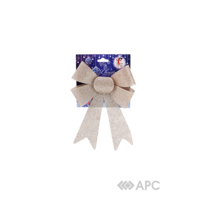 Бант шампань БД 134-515 25 см можна повісити, як на ялинку, так і поставити на стіл або журнальний столик, витончено прикрасивши декоративними стилізованими свічниками, новорічним віночком і застеливши різдвяну скатертину. Прикраса виготовлена із ПВХ, колір шампань.