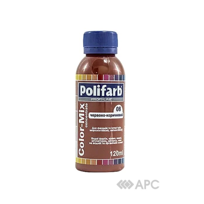 Барвник Polifarb ColorMix 08 червоно-коричневий 0,12 л використовується для отримання необхідного відтінку фарб. Продукція характеризується високими показниками стійкості до впливу ультрафіолету та атмосферних опадів. Консистенція кольорового пігменту в пасті максимально оптимізована під основне завдання: отримання готової фарби з великою покривною здатністю та необхідного кольору. Компанія пропонує широку гамму колерувальних систем. Їх змішування в суворо прорахованих пропорціях дозволяє отримати будь-який відтінок.