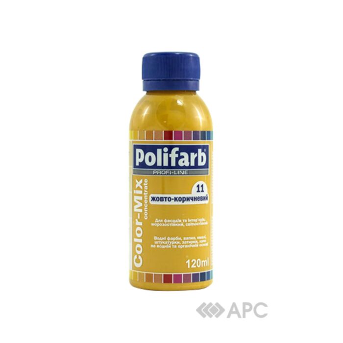 Барвник Polifarb ColorMix 11 жовто-коричневий 0,12 л використовується для отримання необхідного відтінку фарб. Продукція характеризується високими показниками стійкості до впливу ультрафіолету та атмосферних опадів. Консистенція кольорового пігменту в пасті максимально оптимізована під основне завдання: отримання готової фарби з великою покривною здатністю та необхідного кольору. Компанія пропонує широку гамму колерувальних систем. Їх змішування в суворо прорахованих пропорціях дозволяє отримати будь-який відтінок.