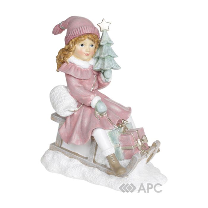 Декоративна статуетка Дівчинка з ялинкою на санчатах BonaDi 707-854 22 см стане окрасою вашого інтер'єру, її можна поставити на стіл або журнальний столик, витончено прикрасивши декоративними стилізованими свічниками, квіткою Пуасенсіі, новорічним віночком і застеливши різдвяну скатертину.