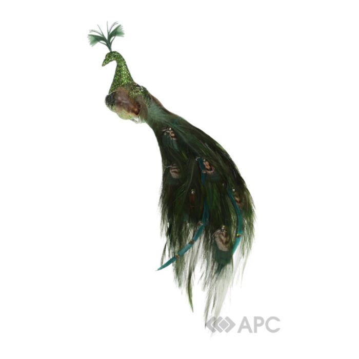 Декоративний Павич BonaDi 499-052 на кліпсі 27 см зелений стане окрасою вашого інтер'єру, її можна поставити на стіл або журнальний столик, витончено прикрасивши декоративними стилізованими свічниками, квіткою Пуасенсіі, новорічним віночком і застеливши різдвяну скатертину.