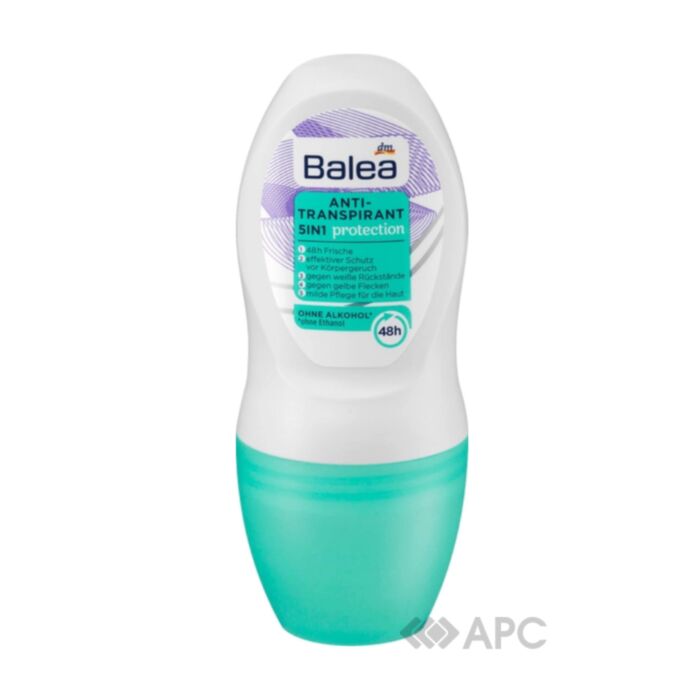 Дезодорант жіночий роликовий Balea 5 в 1 Protection 50 мл — високоякісна продукція німецького виробника, що забезпечує свіжість упродовж 48 годин, ефективно захищає від неприємного запаху поту, не залишає білих слідів на одязі, перешкоджає появі жовтих плям, м’яко і делікатно впливає на шкіру, не пересушуючи, не подразнюючи її. У складі не міститься етанол. Активна формула допоможе вам почуватись впевненою навіть в екстремальних умовах, під час стресових моментів та у найспекотніші дні. Завдяки компактному розміру гігієнічний товар легко поміститься в сумочку або косметичку, ідеально підходить для подорожей або повсякденного життя. Кульковий аплікатор дозволяє наносити продукт економно, без надмірних витрат.