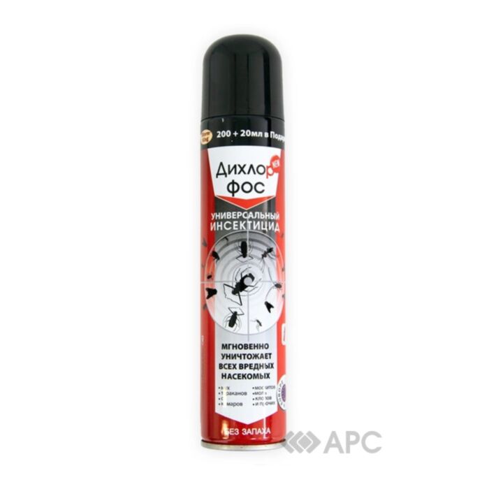 Дихлофос інсектицид Дихлорфос 300 мл миттєвої дії знищує комах після одного натискання. Ефективний проти комарів, мух, молі, тарганів, мурах, шершнів, бліх, клопів тощо, запобігає їх повторній появі. Призначений для застосування всередині приміщення. Універсальний спрей не має вираженого запаху, не залишає слідів на поверхнях.