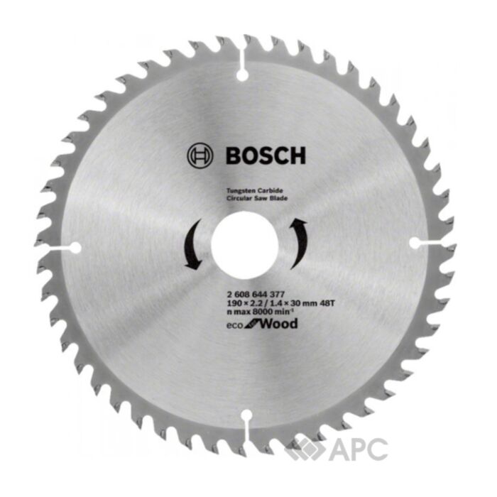 Bosch ECO WO 190x30-48T 2608644377 — диск широкого застосування для деревообробки. Здатний виконувати значний спектр завдань, пов'язаних з обробкою пиломатеріалів. Показує високі результати обробки м'яких і твердих порід дерева. Застосовується для цільних і багатошарових матеріалів. Кількість зубців 48. Діаметр диска 190 мм, посадковий діаметр 30 мм, товщина 1,4/2,2 мм.