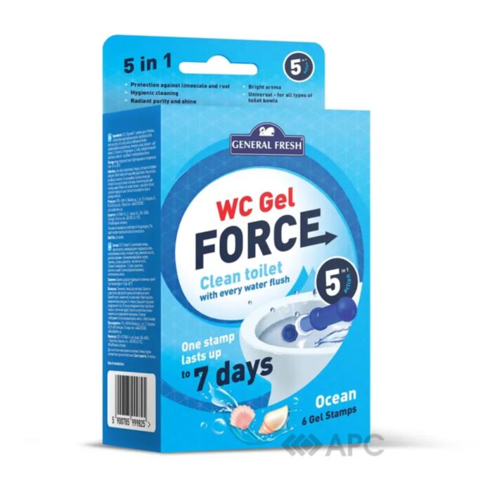 Диски для унітазів гелеві General Fresh Океан 36 мл з активними компонентами поєднують одразу 5 функцій. Засіб захищає від утворення вапняного нальоту, іржі та сечового каменю, забезпечує гігієнічне очищення від забруднень та дезінфікує від мікробів, надає ефектний блиск поверхням, видаляє неприємні запахи й залишає аромат океанської свіжості, при цьому підходить для різних типів унітазів.