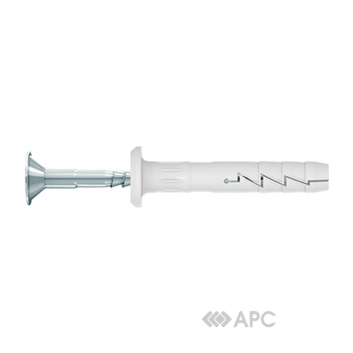 Забивний дюбель з фланцем для універсального використання монтується за допомогою молотка в попередньо просвердлений отвір. Хрестоподібна форма шліца шурупа дозволяє при необхідності викрутити його. Підходить для більшості поверхонь: цегли, бетону, газобетонних блоків і т.д. Фланець робить роботу більш зручною, оскільки дюбель не провалиться в занадто глибоко просвердлений або наскрізний отвір.