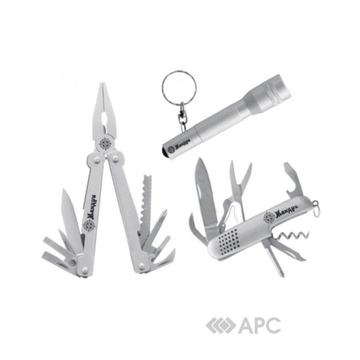 Дорожній набір Мандри 260027020 — незамінна річ в поході на природу і багатьох інших ситуаціях. Всі елементи виготовлені з стійкої до впливу корозії хромової сталі марки 2Cr13. Набір включає: ніж, пилку, відкривачку, ножиці, штопор, ліхтарик, плоскогубці, викрутки та інші необхідні в різних ситуаціях предмети і інструменти