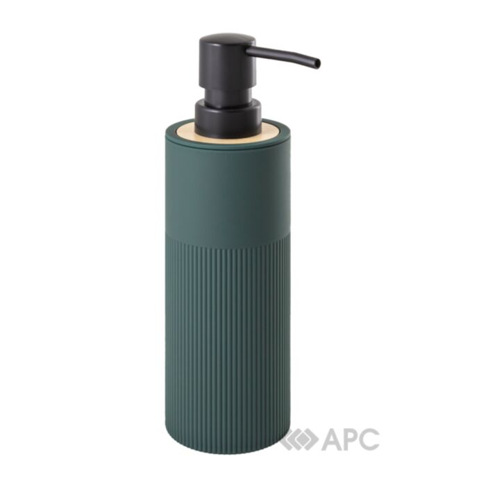 Дозатор рідкого мила серії Frida доступний у зеленому кольорі з матовим покриттям. Він має фактуру у вигляді рельєфних вертикальних смуг. Дозатор доповнений натуральним бамбуком, який є модним аксесуаром.