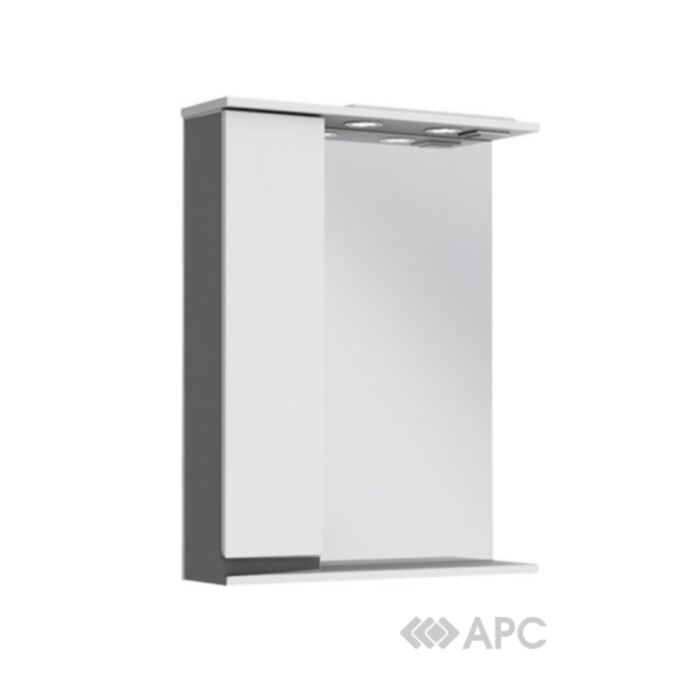 Настінна дзеркальна шафа шириною 65 і висотою 83 см. У конструкцію дзеркальної шафи входять два врізні світильники, вимикач і розетка. Вологостійке дзеркало, кромка по периметру.