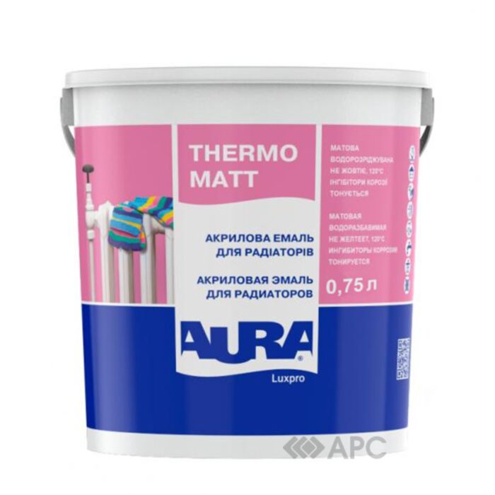 Емаль Aura Luxpro Thermo глянцева - акрилова емаль для радіаторів. Призначена для декоративно-захисного фарбування загрунтованих або раніше пофарбованих радіаторів та елементів систем опалення. Рекомендується застосовувати для металевих, дерев'яних, мінеральних поверхонь і гіпсокартону в сухих та вологих приміщеннях. Добре підходить для фарбування віконних відкосів. Емаль утворює міцне, матове покриття, стійке до багаторазового миття. Зберігає високу білизну, зносостійкість і еластичність. Витримує температуру до +120 °С сухого тепла. Має високу адгезію до різних типів поверхонь, в тому числі до старих алкідних. Витрата емалі - 6-10 м²/л на один шар. Витрата залежить від типу і підготовки поверхні. Купити емаль акрилову AURA LuxPro Thermo матову можна в інтернет магазині АРС. У нас завжди актуальна і доступна ціна. Доставка здійснюється по Україні - Київ, Харків, Львів та ін.