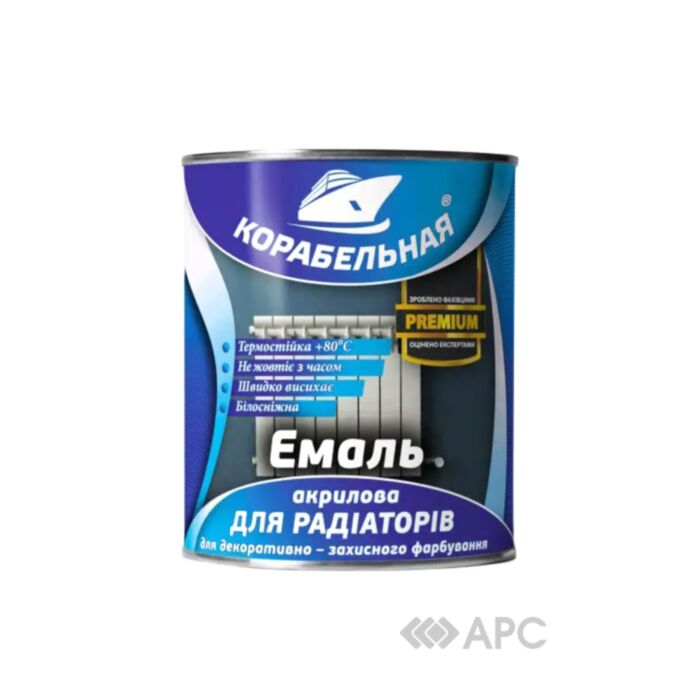 Емаль акрилова Корабельна — це спеціальний матеріал для фарбування заґрунтованих та швидше пофарбованих радіаторів або елементів систем. Має білий колір, зроблена на акриловій основі, підходить для деревини, металевих та сталевих конструкцій. Стійка до перепадів температур, можна розводити водою, залишає гладку, глянцеву поверхню, швидко сохне. Наноситься за допомогою валика, пензля або пульверизатора лише всередині приміщення. Час повного висихання 2 год, об’єм банки 2,5 л.