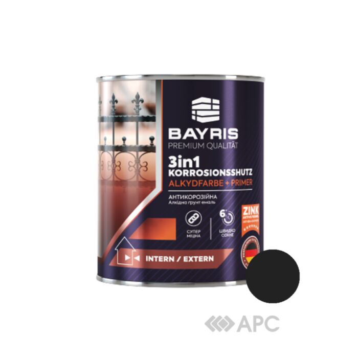 Емаль алкідна Bayris 3 в 1 антрацит 3 кг - високоякісний антикорозійний ґрунт-емаль, розроблений для фарбування металевих поверхонь, таких як сталь, чавун і залізо, що знаходяться як просто неба, так і всередині приміщення.