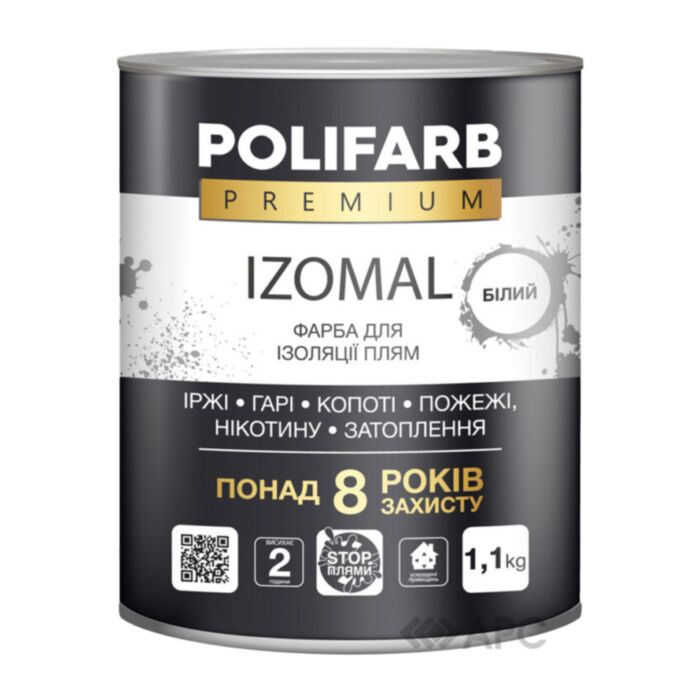 Фарба для ізоляції плям Polifarb Ізомаль біла — спеціалізована швидкосохнуча органорозчинна фарба, яка забезпечує 100% ізоляцію найскладніших плям. Відмінно покриває та ізолює дефекти після пожеж, іржі, води, кіптяви, сигаретного диму та інших забруднень, готуючи поверхню для подальшого нанесення водно-дисперсійних матеріалів.
