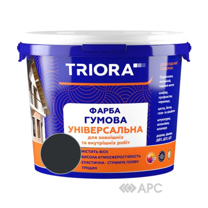 Фарба гумова універсальна TRIORA 247 RAL 9004 чорна 12 кг використовується для фарбування дерев’яних, гіпсокартонних, оштукатурених, зашпакльованих поверхонь, фасадів будинків, дахів, огорож, металевих водостічних труб та ін. Універсальний засіб виконує захисно-декоративну функцію, володіє високим рівнем адгезії до поверхонь. Застосовується як для внутрішніх, так і для зовнішніх робіт.