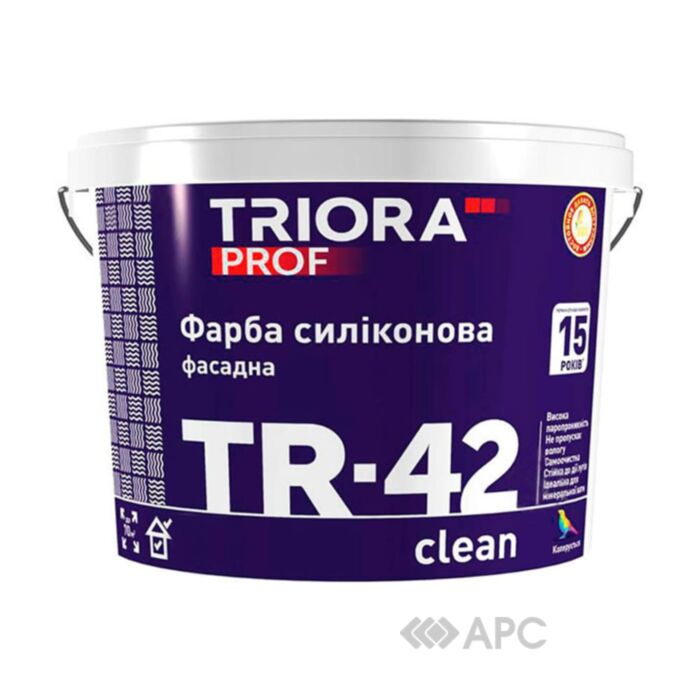 Фасадна фарба Triora TR-42 Clean силіконова 10 л – це високоякісна водоемульсійна фарба, спеціально розроблена для зовнішніх робіт. Завдяки силіконовій основі та матовому ступеню блиску, вона ідеально підходить для фарбування фасадів та стін, забезпечуючи естетичний та довговічний результат.