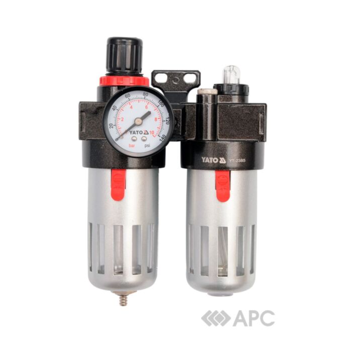 Фільтр-редуктор з манометром YATO YT-2385 1/4 "для очищення стисненого повітря від конденсату і дрібних частинок, води і мінерального масла, для регулювання тиску стисненого повітря і підтримки його на потрібному рівні в пневматичних приводах різного призначення. Складається з редуктора і смазочногог приладу, що дозволяє контролювати рівень тиску в системі.