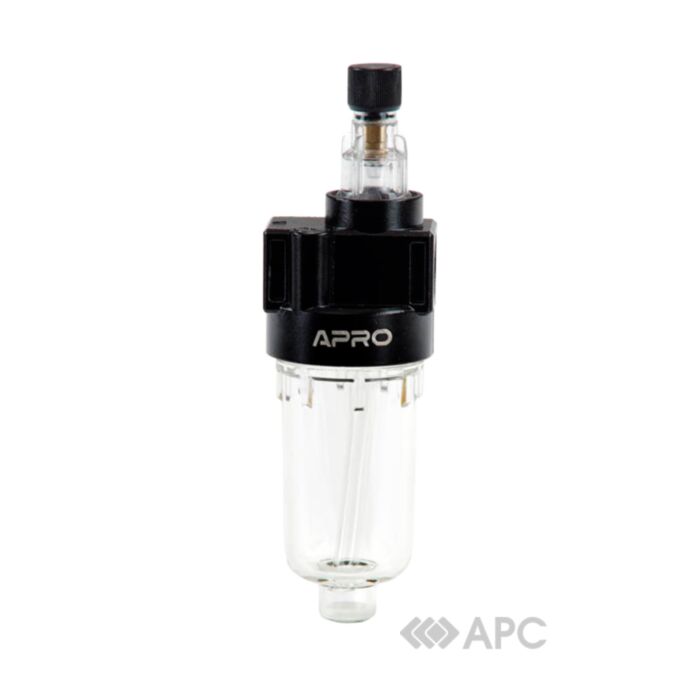 Фільтр-вологовіддільник APRO — це пристрій, що призначений для очищення стисненого повітря від твердих частинок, масляної емульсії та інших домішок. Виготовлений з якісних матеріалів, пропускна спроможність 500 л/хв. Робочий тиск 10 Бар, максимальний 15. Об’єм колби для мастила 25 мл. Присутня різьба має розмір 1/4". Фільтр міняється в залежності від засмічення, цей процес потрібно контролювати, щоб не сталось неприємних ситуацій.