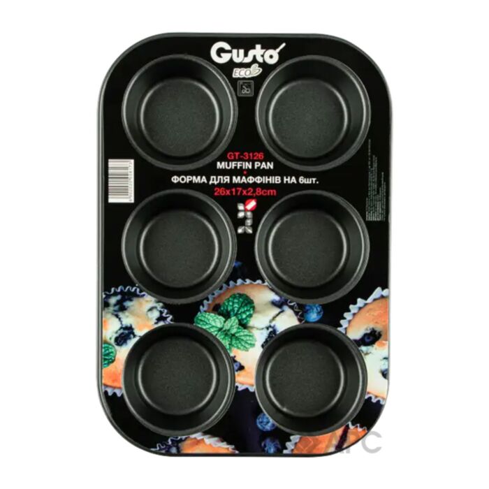 Форма для мафінів Gusto GT-3126 на 6 шт стане чудовим кухонним пристосуванням, яке допоможе наповнити дім неповторним ароматом свіжої домашньої випічки. Антипригарне покриття забезпечує ідеальний вигляд кексів та легке виймання з форми. Порадуйте себе та близьких домашніми солодощами!