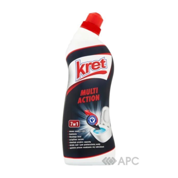 Гель для чищення унітаза Kret Multi action 750 мл ефективно видаляє наліт, бруд, іржу та підтікання, забезпечує чистоту та свіжість туалету. Спеціальна формула та оптимальна консистенція засобу щільно покриває поверхню, розчиняє бруд та стійкі відкладення, усуває неприємні запахи, знищуючи більшість мікробів та бактерій. Очищена поверхня стає гладкою, що суттєво ускладнює подальше осідання вапняного нальоту. Kret Multi action – це надійний вибір для забезпечення чистоти та гігієни вашого туалету.