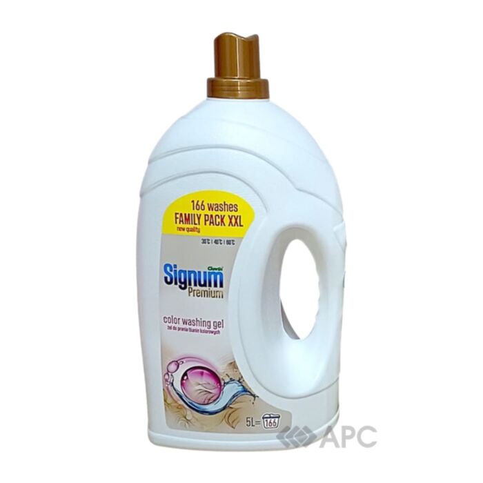 Гель для прання Signum Color — один із найефективніших продуктів, що ретельно очищує навіть застарілі, стійкі плями. Зручна консистенція дозволяє заощадливо його використовувати, тому банки 5 л вистачає на понад 166 циклів прання. Унікальна формула не руйнує волокна, а одяг набуде приємного аромату. Склад не містить фосфатів, тож на машинці не відкладається накип. Засіб відмінно діє за будь-яких температур, типів тканин, забарвлення.
