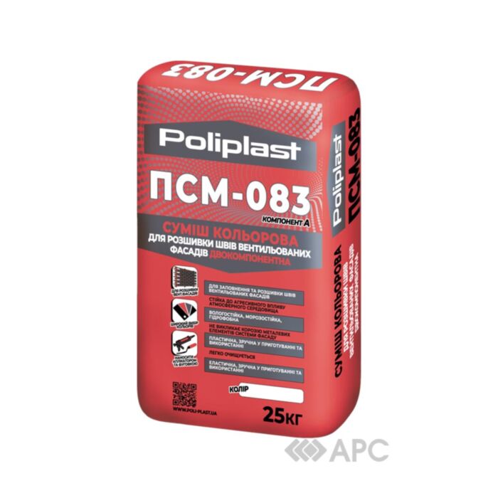 Гідроізоляційна суміш Поліпласт ПСМ-083 двохкомпонентна графіт складається із сухої цементної суміші з мінеральними наповнювачами та модифікуючими добавками (компонент А) та полімерної дисперсії з модифікуючими домішками (компонент Б). Призначена для гідроізоляції та одночасного декоративного оформлення швів при облицюванні вентильованих фасадів, імітуючи цегляну кладку або кам'яне облицювання, а також для розшивки швів клінкерної, керамічної, силікатної та іншої лицьової цегли, натурального та штучного каменю, термопанелей (при глибині шва від 5 мм) та стін з дерев'яного бруса, вагонки, дошки. Суміш характеризується високою еластичністю, стійкістю до агресивного впливу атмосферного середовища, вологостійкістю, морозостійкістю, гідрофобністю, не викликає корозії металевих елементів фасадної системи.