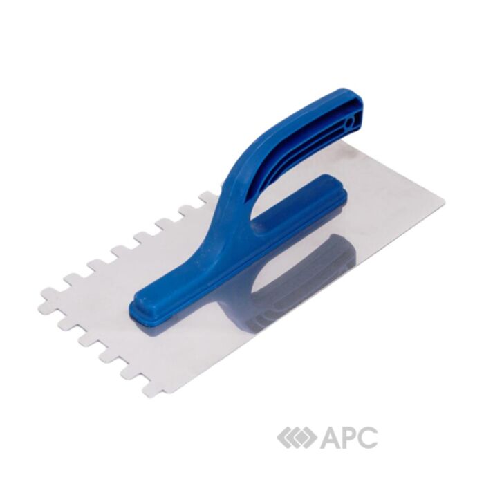 Гладилка Сталь 37045 зубчаста 8*8 мм 13*28 см використовується в процесі обробних робіт для швидкого та рівномірного нанесення суміші та цементу, їх розподілу та розрівняння на вертикальних та горизонтальних поверхнях. Полотно виробу максимально гладке та рівне. Воно виконане з нержавіючої сталі та оснащено плоскими широкими зубами, які дозволяють при розрівнюванні створювати борозенки й канавки, що в майбутньому покращує адгезію нанесеного шару з подальшим матеріалом. Зручне пластикове руків'я забезпечує надійний стабільний хват та суттєво полегшує робочий процес. Інструмент є легким, зносостійким, просто відчищається від забруднень та залишків робочого матеріалу.