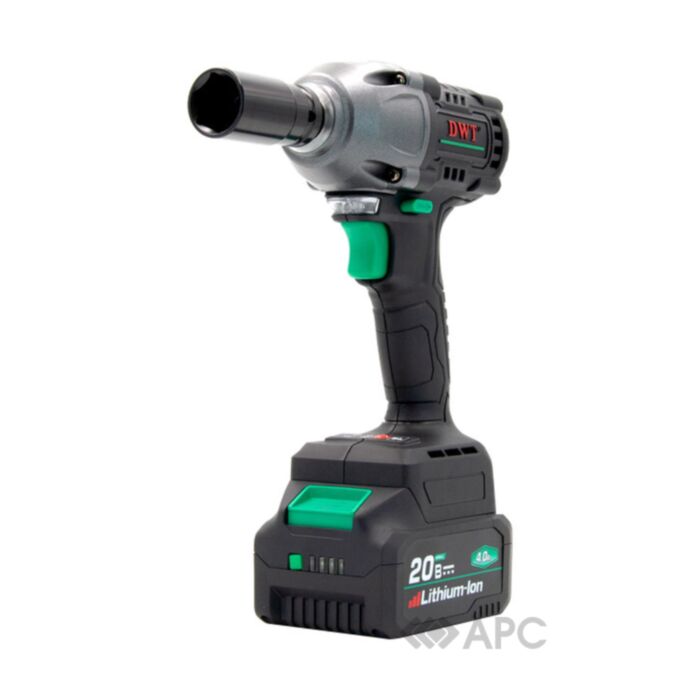 Гвинтоверт працює від потужного Li-ion акумулятора 20 В ємністю 4 Ач і видає максимальний крутний момент до 500 Нм, що дозволяє працювати з різьбою від M6 до M22. Електронне регулювання швидкості в діапазоні 0-2400 об/хв та кількість ударів до 3000 уд/хв гарантують точний контроль над процесом. Інструмент оснащений тримачем насадок 1/2" квадрат і має функцію реверсу.
