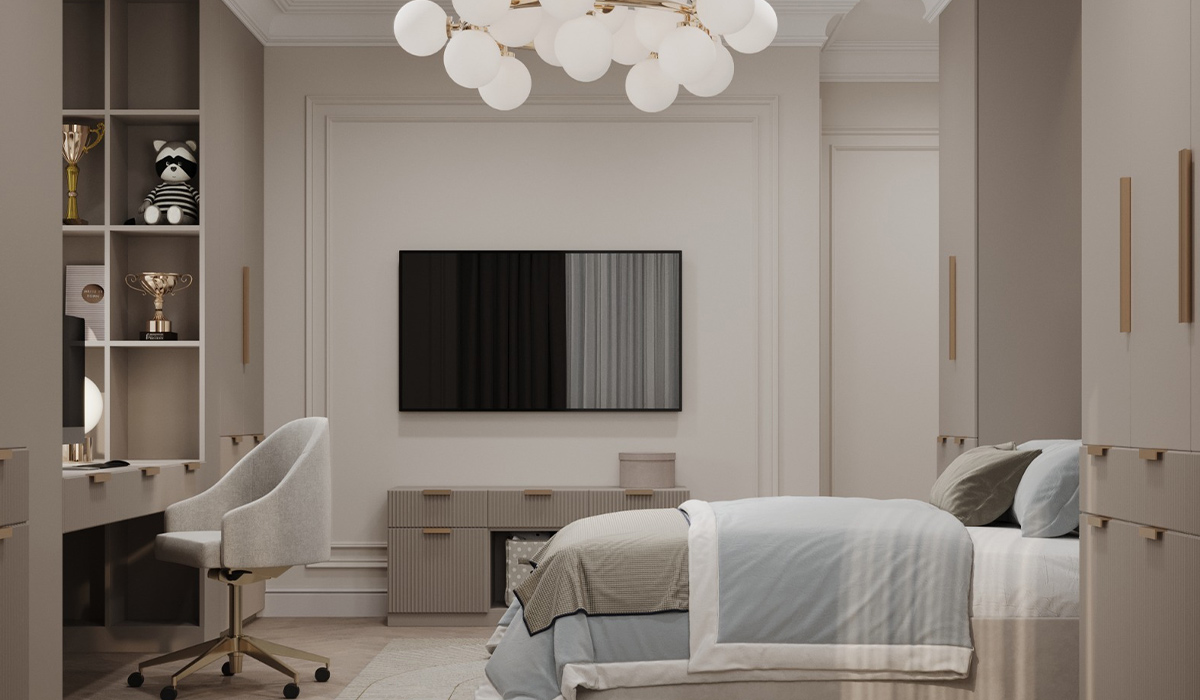 Створюючи безпечний та функціональний простір для дитини, не слід забувати про важливість емоційного розвитку і подбати про естетику інтер’єру. Легкі світлі відтінки створюють відчуття спокою і захищеності, а ретельна організація простору забезпечить щоденні зручності для гри, розвитку та відпочинку. Плитка для підлоги Атем Praia Crema Polished Rec 59,5*59,5 см бежева є відмінним практичним рішенням, оскільки вона добре поєднується з “теплою підлогою”, легка в догляді, надійна та довговічна. Комфортним місцем для сну та відпочинку слугує ліжко Delavega К16 Hector 02 світло-бежеве з комплектом постільної білизни Laplandia 02453 сатин страйп 150*220 см блакитний. Розміщення меблів гармонійно доповнює функціональність кімнати, пропонуючи достатньо місця для зберігання особистих речей, іграшок, постільної білизни тощо. Комод Alf Claire KJCL125 pearl line, розміщений під телевізором, доповнює елегантну естетику мелевих фасадів красою вертикального рельєфу. Легкості простору додає “біла хмаринка” люстри Altalusse INL-5106P-12 Gold, даруючи м’яке тепле світло для ідеального комфорту і затишку.