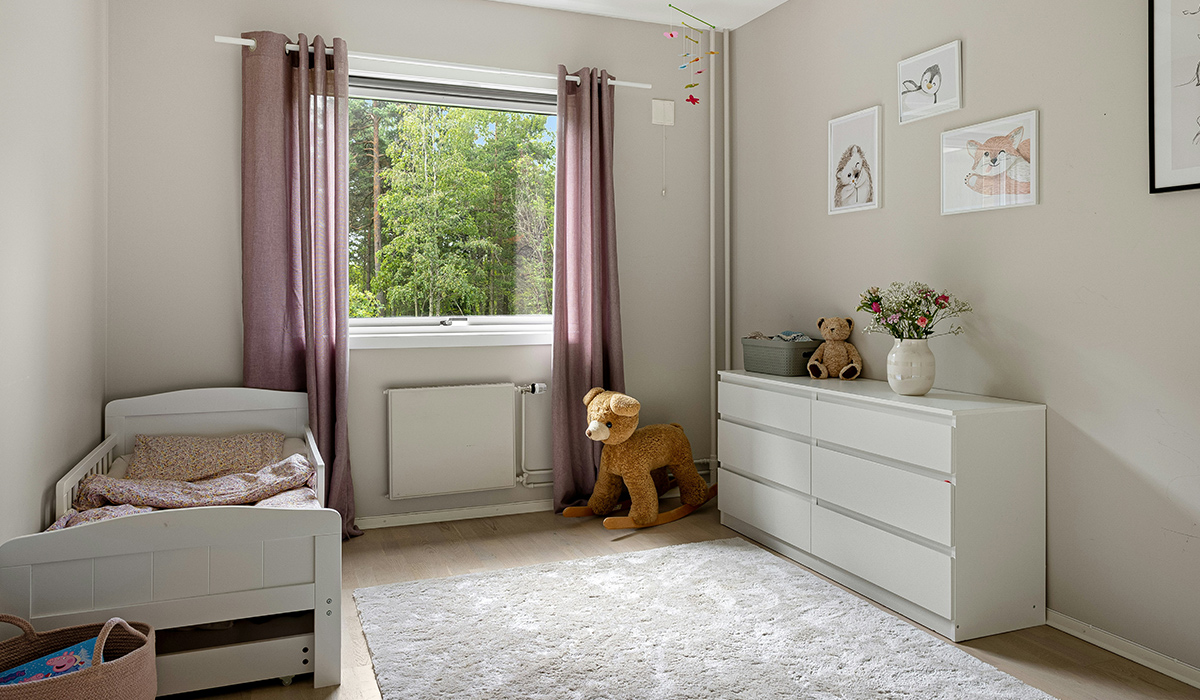Пастельну палітру дитячої кімнати оживляють веселі малюнки, м’які іграшки та свіжі квіти, адже дитинство – це щоденні радощі від пізнання світу та відважні спроби його покращити. Меланхолійний простір цього дитячого царства створюють шпалери вінілові Vinil Остін СШТ 2-1557 холодно-бежеві на стінах, тоді як рожеві штори вносять яскраве пожвавлення в інтер’єр кімнати. Підлогу оздоблює ламінат Kronopol Easy Step 4944 Дуб аметист 32 клас 4V 8 мм, що дарує теплий природний відтінок та приємні тактильні відчуття для маленьких ніжок. Його стильно підкреслює плінтус Salag SG56 SG5600 00 білий 56*18*2500 мм, що гармонійно збагачує поєднання світлих елементів. Праворуч розміщений комод Merx Moderno МН300 білий 26008974 для зручної організації речей в кімнаті. Кошик з кришкою Irak Plastik SР-296 може зберігати книги, іграшки, канцтовари чи навіть дитячі таємниці.
