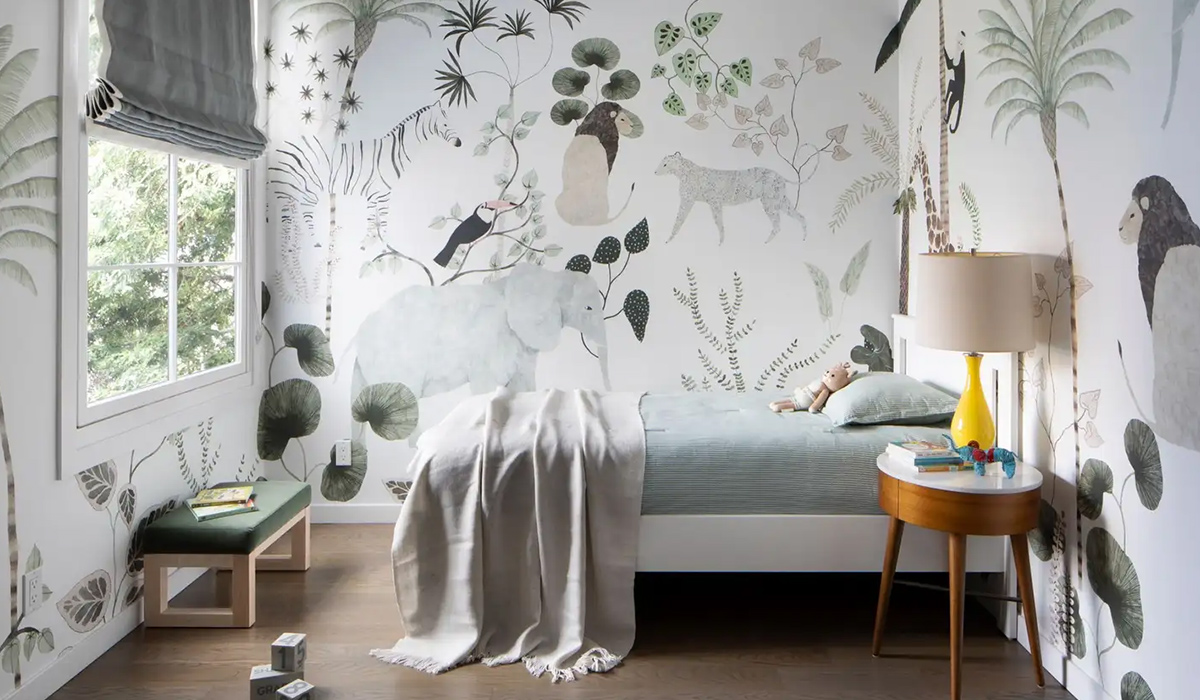 Чарівний світ дитинства демонструє продуманий інтер’єр кімнати, де легкість та безтурботність межують з бурхливою уявою та спрагою пізнання навколишнього світу. Теплий натуральний відтінок ламінату Kronopol Parfe Floor Synchro 7105 Горіх Валенсія 32 клас 4V 8 мм гармонійно поєднується з химерними малюнками на білих шпалерах, що створюють вихор енергійної гри фантазії. Елегантний перехід між ними малює білий плінтус Оміс МДФ білий гладкий 100*19*2400 мм. Зручне акуратне ліжко Laser LASZ01 0,9 подарує дитині солодкі сни та здоровий відпочинок. А для того, щоб сховатися від тигра, змайструвати кокон для чарівного метелика чи врятувати довгу шию жирафи від холоду є м’який сірий плед SoundSleep Список бажань 51970708 140*200. Функціональний комплект журнальних дерев'яних столиків Milan S2 білого кольору можна адаптувати під будь-які потреби та завдання, використовуючи їх для гри та навчання.