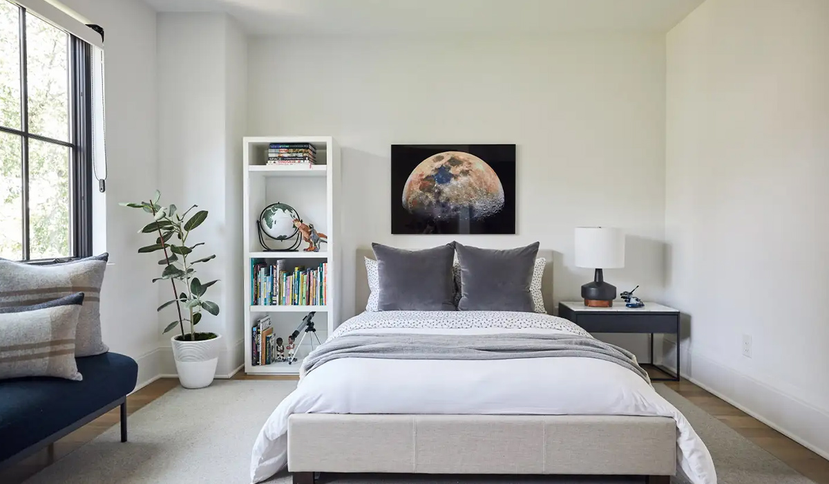 Створення інтер’єру дитячої кімнати – завдання не просте, адже окрім практичності та функціональності, слід врахувати особливості характеру дитини та її зацікавлення. Вибір матеріалів та елементів декору важливий для того, щоб простір став безпечною фортецею та затишним місцем молодої людини. Якщо важлива повітряність і легкість приміщення, варто обрати фарбу вапняну Feromal Kalkfarbe білосніжну 5 л для стін, що збереже атмосферу невимушеності для цікавих планів та розвитку фантазії. Теплий спокій подарує підлога оздоблена ламінатом Rezult Authentic Plus AP 321 Дуб Люблін 33 клас 4V 10 мм. Комфортне ліжко Texas, розміщене в центральній частині, підкреслює важливість відпочинку та здорового сну. Лаконічний диван DLS Браво синій створює ефектний колірний акцент у спокійній гамі кімнати, забезпечуючи енергійне пожвавлення та емоційне піднесення. В кутку знаходиться стильна тумба приліжкова Merx Life ЛФ200 антрацит 26010165(Л), що виконує практичну функцію та має елегантний сучасний вигляд. Меланхолійного спокою додають м’які подушки декоративні Decorator B 235 45*45 см темно-сірі на ліжку, мов теплі обійми важливих людей.