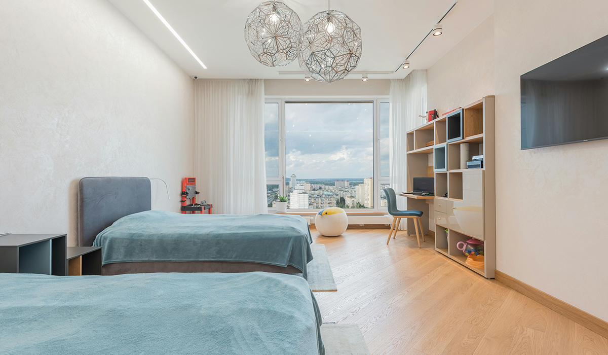 Дитяча кімната Varioclic Exclusive 5G створює ідеальний простір для розвитку та відпочинку її непосидючих мешканців. Теплоти та затишку додають шпалери вінілові Sintra Lorraine світло-бежевого відтінку, що візуально пом'якшують стіни та добре поєднуються з пастельно-синіми елементами. Ламінат Varioclic Exclusive 5G поєднує легкість догляду і присутність природи, завдяки вишуканому дизайну з ефектом світлої деревини. Композицію долівки вдало завершує плінтус Arbiton Indo 7009 в кольорі дуб вишуканий.Освітлення кімнати забезпечують стильні лампи-павутини в центральній частині стелі, обрамлені низкою світильників світлодіодних Feron LED AL542 СОВ з елегантними біло-срібними корпусами. Робоча зона розміщена біля вікна, щоб забезпечити достатню кількість світла та збільшити концентрацію уваги дитини. Стілець обідній дерев'яний Меблі Тиса Міка жасмин 95 у кольорі бук з м’якою спинкою доповнює гармонію приміщення та дозволяє учню почуватися комфортно під час виконання домашніх завдань. Елегантні м’які покривала відтінку індиго створюють атмосферу спокою та морської прохолоди, забезпечуючи якісний відпочинок мешканцям.