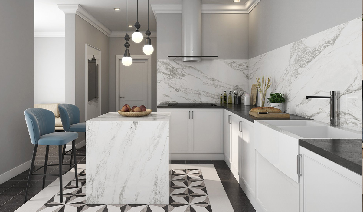 Монохромна композиція кухні нагадує чітку геометрію шахової дошки, де кожна фігура має свою особливу роль і місце. Чого вартує лише строкатий візерунок підлоги, що поєднує чіткі квадрати керамограніту Megagres Black 6603 Pol 30*30 см чорного та керамограніту Paradyz Vadim Bianco 30*30 см білого. Він створює сміливий акцентний фон для спокійного та затишного інтер’єру, додає динаміки та екстравагантності, збалансовує поєднання базових кольорів. Плінтус Оміс МДФ білий матовий 80*10*2200 мм малює чітку лінію, що розділяє площини та додає багатогранності простору. Елегантні димчасті стіни різко переходять у світлі мармурові барви кухонного фартуха, оздобленого керамогранітом Allore Group Avenzo Silver F P Mat Rec 60*120 см білим. Чорна поверхня стільниці стильно виокремлює місце, де кухонні ритуали набувають особливого драматизму і навіть містики. Простора біла мийка вражає вишуканою простотою форми, а змішувач для кухні Grohe Eurosmart Cosmopolitan 30193000, попри всі його бездоганні функціональні характеристики, служить відмінним декором й естетичним доповненням. Духмяний запах свіжого хліба, плетиво кошика, фрукти, зелень, букет колосків та дошка кухонна з дубовими вставками Mazhura Alder mz323042 30*19*1,5 см творять атмосферу затишку, де творча енергія кухаря перетворюється на гастрономічні шедеври.