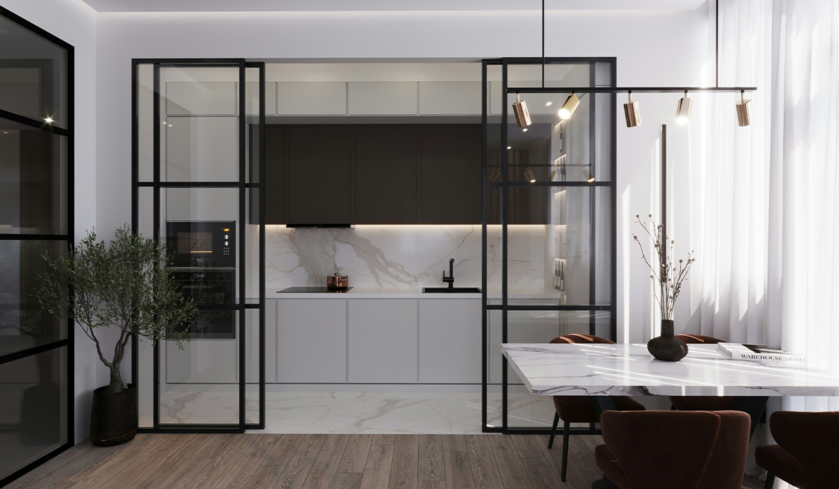 Ефектна сучасна кухня в монохромних кольорах вражає дизайнерським рішенням поділу приміщення на зони. Скляні розсувні двері розділяють простір для приймання їжі та її приготування, забезпечуючи цікавий естетичний бар’єр між ними. Чіткий контраст демонструє підлога, оздоблена керамогранітом Cerama Market Staturio Valcano 60*120 см білим та ламінатом Kastamonu River WR Delaware Oak SRV003 5088740 4V 32 клас 8 мм темного відтінку натуральної деревини. Елегантні білі кухонні меблі красиво контрастують з вишуканими чорними деталями сантехніки, а саме кухонною мийкою Adamant Prizma 59*49,5*20 см чорний-03 та змішувачем для кухні Aqua Rodos Rimini 07 Black Matte. Витяжка Eleyus Into 960 52 BL чорна розміщена над плитою та ефективно очищує повітря в кухні. Точкові світильники підвісні Feron ML375 чорні м’яко підсвічують поверхню та дають достатньо світла для роботи на кухні. Комфортну їдальню прикрашає стіл обідній розкладний Vetro Урбано TML-896 140*90 см калакатта крістал/чорний, що може вмістити велике родинне застілля. Мармурова поверхня з гартованим склом стильно доповнює інтер’єр та додає світла й простору.