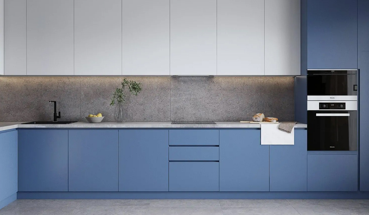 Класична прохолода блакитного кольору доречно врівноважить гаряче серце кухні, де парують смачні страви, кипить чайник, а духова шафа лоскоче солодким ароматом домашньої випічки. Використання яскравих волошкових фасадів у цій кімнатні акуратно збалансоване спокійним сірим керамогранітом Cerrad Takoma silver rect 59,7*59,7 см на підлозі та керамогранітом Intercerama Tesoro 202072/MR Rec 60*120 см в оздобленні кухонного фартуха. Такі поверхні є легкими в догляді, довговічними у використанні та стильно доповнюють сучасну естетику кухні. Простора світла стільниця гармонійно контрастує з чорною мийкою та змішувачем для кухні Aqua Rodos Rimini 03 Black Matte, створюючи виразний акцент функціональної зони. Робоча поверхня добре освітлюється за допомогою світлодіодної стрічки Feron LS704 60 SMD/м білого кольору. Тут легко захопитися дослідженням нових рецептів, а ваза Rona Ambiente 5050/29 29 см з гілочкою яскравої зелені подарує натхнення для кулінарних експериментів.