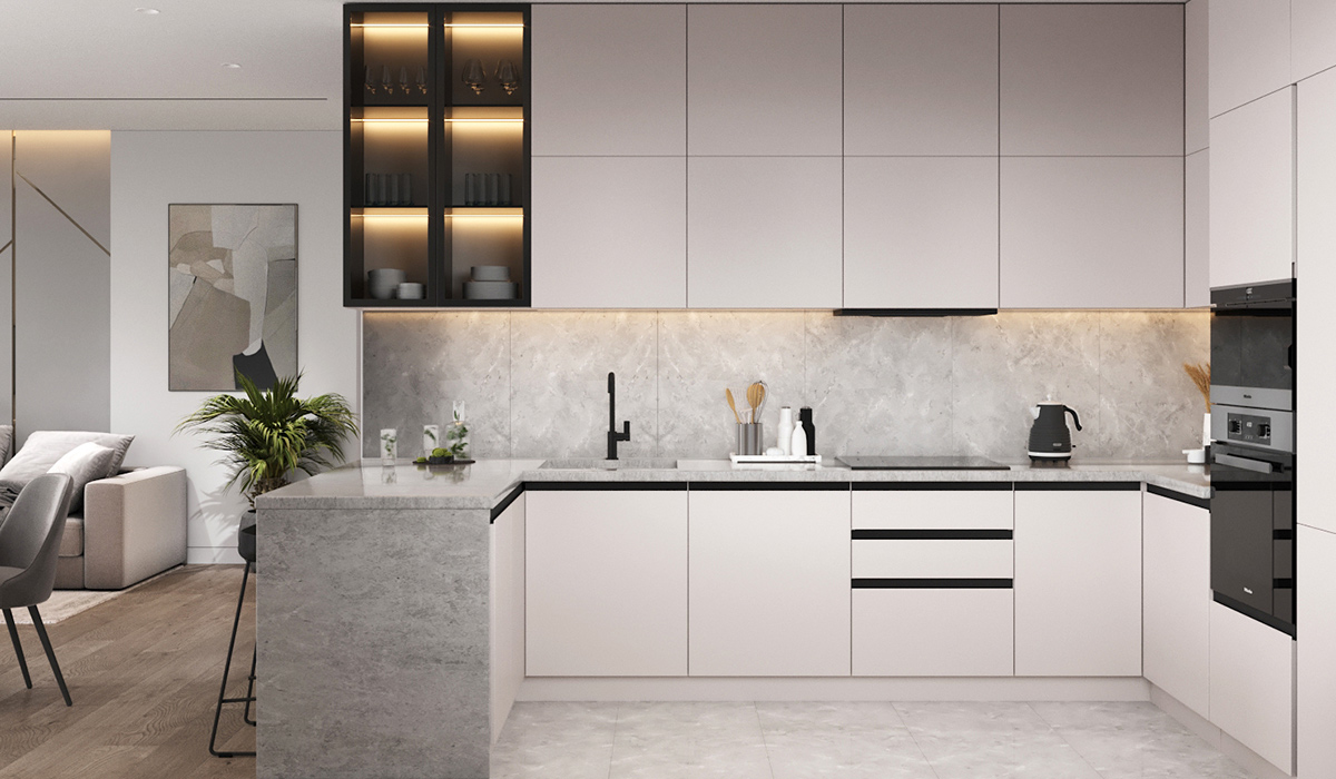 Білий колір для оздоблення сучасної кухні ніколи не стане прісним, банальним чи нецікавим, адже щедра різноманітність інноваційних матеріалів дозволяє експериментувати з текстурами, відтінками та незвичними поєднаннями. Для кімнати, що на фото, обрали світлу палітру бази та доповнили її виразними акцентами темних деталей. Фартух та підлога оздоблені керамогранітом Cersanit Randy Cream Satin Rec 59,8*59,8 см кремовим, що вносить природні барви каменю в гармонію елегантної кухні. В такому ж виконанні оформлена стільниця, на фоні якої змішувач для кухні Aqua Rodos Luna 13001 Black, індукційна плита, електрочайник Ardesto Otter EKL-450B 1,7 л мають контрастний вигляд і вдало об’єднують функціональну зону з темною вітриною та побутовою технікою чорного кольору. Лаконічна конструкція витяжки Eleyus Gemini 1200 LED 52 BL чорної легко ховається за фасадами меблів, залишаючи лише невелику панель сенсорного керування, що дозволяє швидко й легко змінювати режими чи налаштувати освітлення. Підсвітка вітрини ефектно увиразнює контури вишуканого посуду та набору келихів для вина Ecomo Glint GB086303 360 мл 6 шт. Це додає певної театральності та глибини, що безумовно збагачує інтер’єр кухні. Вбудовані світильники точкові Horoz Electric 016-071-0012 LED 12W 4200K білі – це чудова альтернатива габаритній люстрі, що дозволяє зберегти вільний простір, розставивши потрібні світлові акценти у потрібних місцях. Зелень кімнатної рослини завжди доречна в монохромному інтер’єрі, адже додає яскравості й виразності простору.