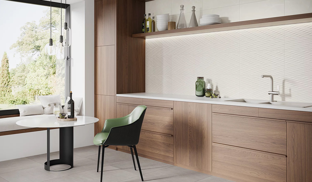 Над круглим обіднім столиком бачимо витончений світильник підвісний TK-lighting MARCO (3 лампи), який створює м'яке освітлення. А на самому столі стоїть бокал з набору келихів для вина Ecomo Glint (410 мл, 6 шт.), готовий до вечірнього застілля та приємних моментів відпочинку. Ця кухня не лише функціональна, а й наповнена стильними деталями, що створюють унікальну атмосферу домашнього тепла.