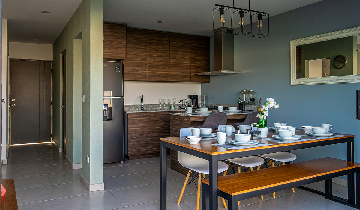 Графітові відтінки сучасної кухні створюють камерну атмосферу та демонструють елегантність оздоблення. Практичне покриття підлоги плиткою Golden Tile Terragres Stonehenge 44GП70 60,7*60,7 см світло-сірого кольору забезпечує приємний фон інтер’єру та легку контрастність з білим плінтусом Оміс МДФ дуб білий 80*19*2400 мм. Фасад кухонних меблів малює горизонтальні лінії структури деревини, а ефектний змішувач для кухні Kroner KRM Odra-C032BLK чорний додає естетики робочій поверхні. В зоні їдальні домінує стіл обідній Метал-Дизайн Бінго Лайт 115*75 см вествуд/чорний, сервірований для приймання гостей. Естетику столового набору Ritzenhoff & Breker Lund 208870 16 предметів органічно доповнює вишукана біла орхідея. Келихи для вина Schott Zwiesel Classico 121239 310 мм сяють легкістю та прозорістю чистого скла, очікуючи нових барв благородних напоїв. Горизонтальне дзеркало розширює простір та додає глибини і яскравості інтер’єру.