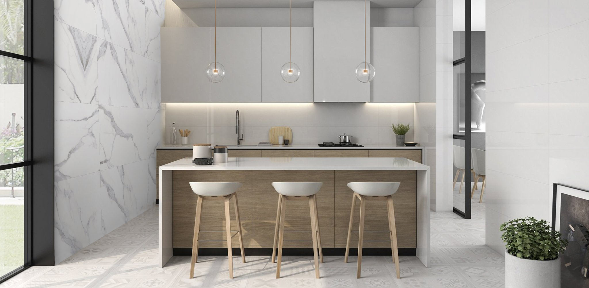 Почнемо з фону, де на одній стіні розташований керамограніт Allore Group Sicilia White F P Mat Rec у білому кольорі. Ця високоякісна плитка виглядає дуже стильно і витончено, надаючи приміщенню свіжий і сучасний вигляд. Великий формат робить стіну більш просторою, а матове покриття надає плитці дискретності. На іншій стороні можна побачити плитку для стін Golden Tile Tutto bianco, модель G50061. Це облицювання з сатиновим фінішем додає кухні легкість, створюючи чистий свіжий образ. Формат 30x60 см досконало підходить для розташування навпроти вікна.