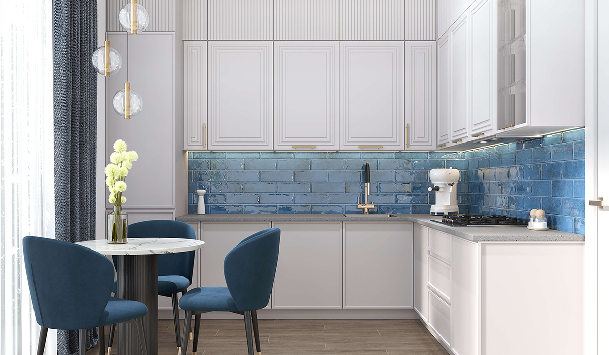 У цій стильній кухні кожен елемент відіграє свою роль, починаючи з елегантного керамограніту Intercerama Modelo 192022 Rec, що витончено вкриває підлогу. На стінах кухонного фартуха розташована синя плитка Golden Tile Vintage VGM061, додаючи примітного шарму та вишуканості. Щоб підсвітити робочий простір, використана світлодіодна стрічка Feron LS108 COB IP20 з 320 світлодіодами на метр, яка ефектно виграє на фоні шафок і кутка. Над плитою знаходиться витяжка Eleyus Storm 700 50 IS з нержавіючої сталі, що надає не лише стильний вигляд, але і високу ефективність у вентиляції. З іншого боку столу встановлений змішувач для кухні Laveo POLA BAP_778D в чорно-хромовому виконанні. Він, в поєднані з раковиною, додає сучасний акцент до цього інтер'єру. На тому ж столі, біля пенала, розміщений білий млинок для спецій Ringel Rhine RG-5116/w, що підкреслює функціональність та зручність кухонного простору. Ця кімната ідеально поєднує в собі елегантний дизайн та практичність, створюючи затишну атмосферу для кулінарних експериментів та щоденних радощів життя.