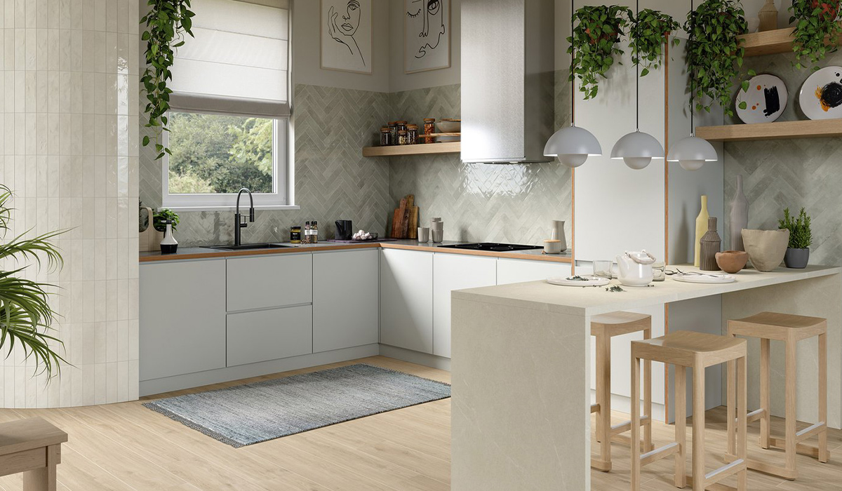 Кожна деталь цієї кухні заповнює важливу частинку загальної композиції, що склалася в довершену гармонію естетики та функціональності. Прямокутні плитки бежевого керамограніту Cersanit Wood Emberwood Beige Rec 19,8*119,8 см на підлозі імітують дерево натуральних відтінків, створюючи відчуття тепла та домашнього затишку. Особливий акцент на стінах створює плитка Golden Tile The Wall Carrara 6L0251 10*30 см біла. Її глянцева поверхня та мармурові прожилки додають простору вишуканості та світла, візуально розширюючи його. Біля вікна облаштована зона миття, де привертає погляд змішувач для кухні Aqua Rodos Bolonia 02 Black Matte. Його матовий чорний колір створює стильний контраст зі світлими поверхнями, підкреслюючи сучасний дизайн кімнати. Над варильною поверхнею розташована витяжка Barriviera Mantika Isola 60 900M3 з нержавіючої сталі. Її стильний дизайн та висока потужність ефективно очищають повітря, залишаючи його свіжим, а блискуча поверхня гармонійно поєднується з іншими хромованими елементами. На робочій стільниці бачимо багато дрібних аксесуарів, що неодмінно знадобляться в приготуванні страв. Для підтримки порядку та зберігання продуктів на кухні є дві ємності з бамбуковою кришкою: Wilmax WL 888506 розміром 10*20,5 см 1300 мл та Wilmax WL 888505 10*17,5 см 1100 мл. Зелені рослини, інтегровані в дизайн кухні, створюють природну легкість приміщення, нагадуючи весняний сад чи затишний оазис.