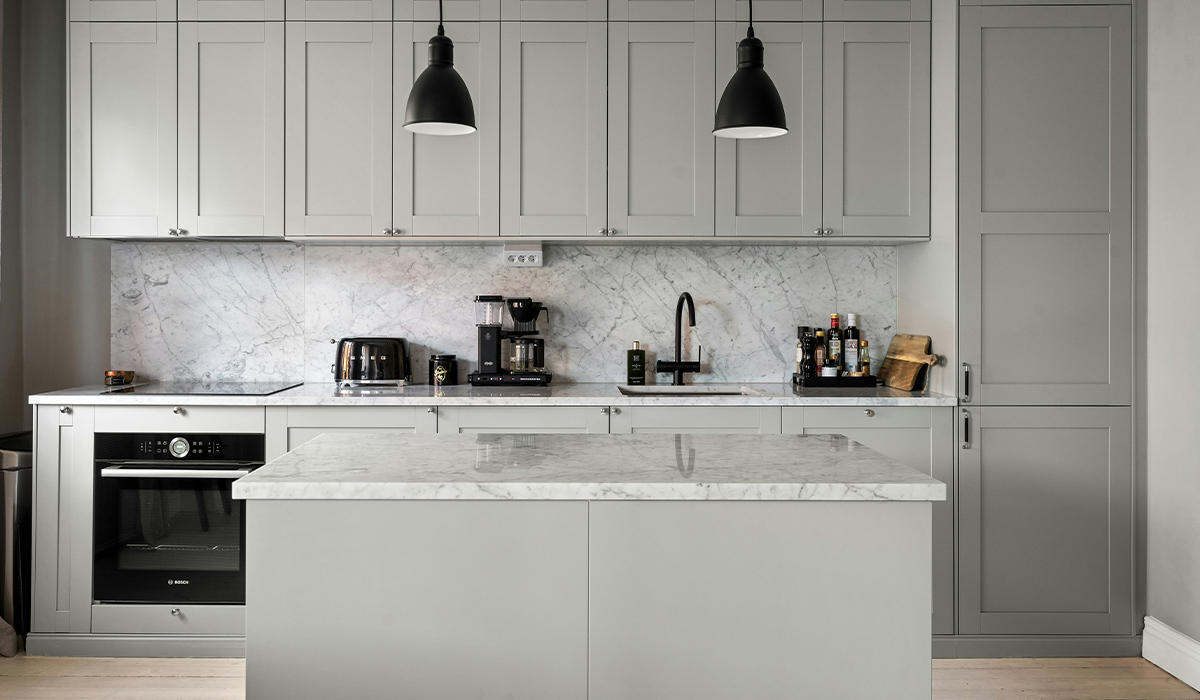 Теплий відтінок сірих фасадів разом з чорними деталями інтер’єру сучасної кухні створюють гармонійний простір для щоденних кулінарних справ. Тут легко поєднується міцна поверхня керамограніту Golden Tile Terragres Calacatta Extra Н90580 60*60 см білого матового кухонного фартуха з легкою монохромністю інших поверхонь. В облаштуванні підлоги використано ламінат Kronopol Milo 3034 Дуб Феррара 32 клас 4V 8 мм, а контрастний перехід між підлогою і стінами виконує білий плінтус Grand Decor HCR507 78*18*2000 мм. Виразні акценти розставляє побутова техніка, посуд та аксесуари в чорному кольорі. Два світильники підвісні Vio Concept VCDS-P0019-1-BK над робочим острівком додають функціональності простору, ефектно виділяючись на тлі сірих фасадів. Елегантний змішувач для кухні Ferro Zumba BZA4BSSGM Gun metal дозволяє змінювати форму в залежності до поставлених завдань, що спрощує роботу на кухні. Використання чорного кольору в дизайні кавоварки, плити, каструлі додає елегантного шарму кухні та робить її приємним місцем для приготування їжі та затишних трапез.