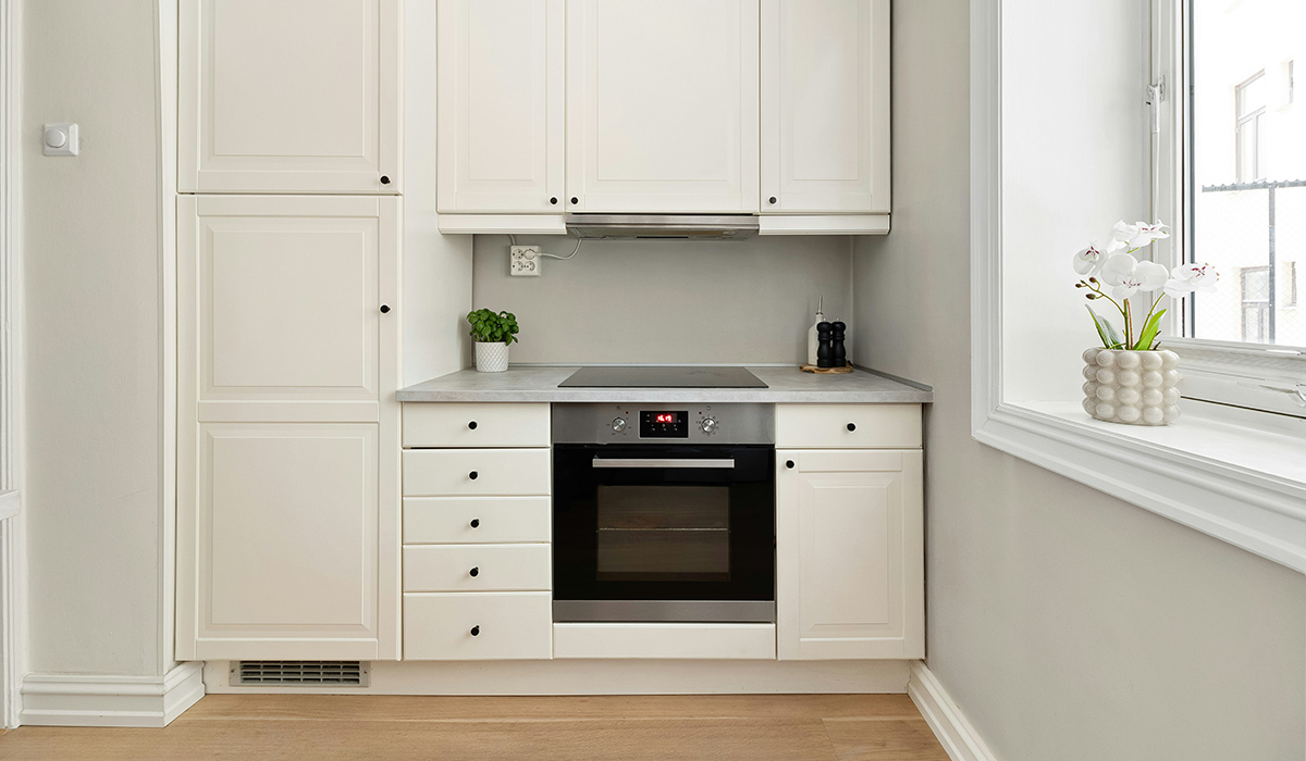 Обравши молочний колір для оздоблення невеликої кухні, можна досягти гармонії та легкості інтер’єру, а збереження максимальної функціональності такого приміщення стане приємним бонусом. Отже, ламінат Kronospan Atlantic 5947 Дуб Історичний 33 клас 4V 10 мм на підлозі створює спокійний теплий фон для затишної кухні. Він має високі показники зносостійкості та зберігатиме відмінний вигляд протягом років. Поверхні стін варто покрити інтер'єрною фарбою для кухні та ванної Element акриловою білою 2,5 л з відмінною стійкістю до забруднень, появи грибка та механічних пошкоджень. Молочні фасади створюють відчуття чистоти, охайності та витонченої елегантності. Вони ховають все зайве та залишають достатньо простору для кухонних справ. Функціональна витяжка Eleyus Storm 700 60 IS нержавіюча сталь забезпечить відмінну циркуляцію повітря та надійне виведення неприємних запахів. Інтенсивність освітлення легко регулювати за допомогою димера Videx Binera Led 200 Вт срібний шовк, обираючи потрібний режим відносно певних завдань, настрою чи потреби. Стильні аксесуари, як-от пляшка для олії Bormioli Rocco Victoriana 123414MEC121990 250 мл, доповнюють і розкривають справжню гармонію і красу сучасного інтер’єру.