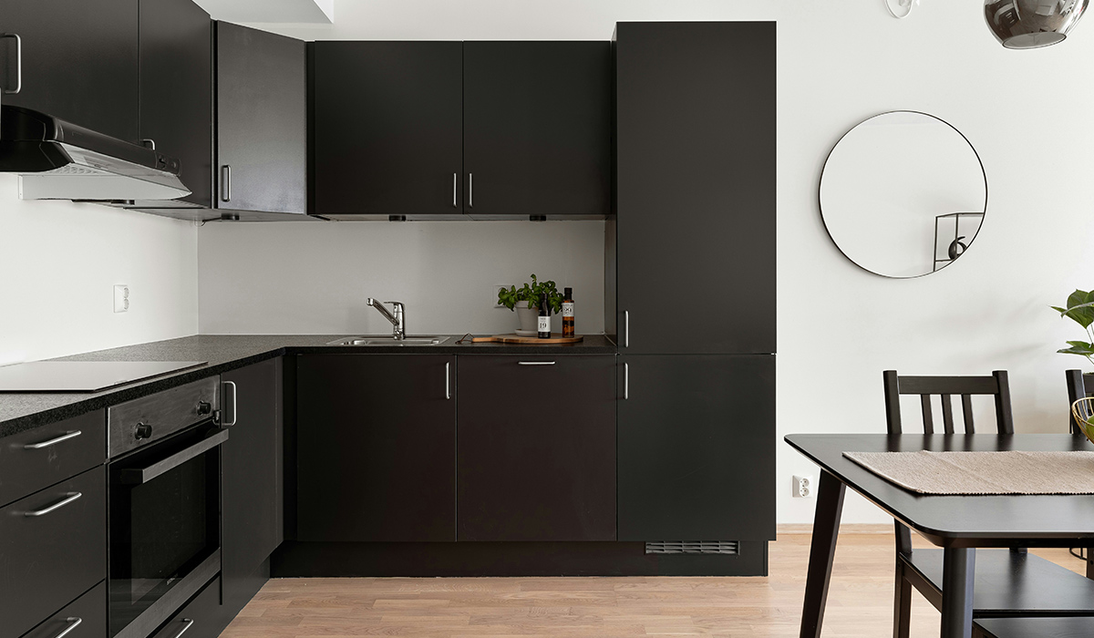 Сучасна кухня в стриманому мінімалізмі нагадує елегантний смокінг впевненого чоловіка – стильно, ефектно, без зайвих дрібниць. В базовому поєднанні кольорів особливу роль відіграє оздоблення стін, в цьому випадку інтер'єрна фарба латексна Element 7 база А шовковисто-матова біла 10 л створює нейтральний фон кімнати, наповнюючи її теплим затишком. Підлога демонструє природні лінії та м’які відтінки ламінату Kronospan Super Natural Classic K485 Дуб Нейчрал Стерлінг 4V 8 мм. Її естетичним завершенням є витончений плінтус ТІС ПЛГ-0085 з коекструзією дуб ванкувер 56*18*2500 мм. Рівні поверхні чорних меблів втілюють практичність та гармонію сучасних матеріалів, підкреслюючи лаконічність витяжки Eleyus Line I 50 BL чорної. Інтегрована кухонна мийка Kroner KRP-Geburstet-5050HM 3.0/1.0 мм 215 50*50 см гармонійно поєднується з функціональним змішувачем для кухні Ferro Basic BBC4, створюючи комфортний простір для більшості кулінарних справ. М’яких ліній і простору додає кругле дзеркало Studio Glass Ark Royal Black Iron Mirror 70*70 см на стіні, що розширює візуальне сприйняття кімнати. Важливим доповненням чорно-білого інтер’єру є зелень кімнатних рослин, яка прикрашає та оживляє простір.