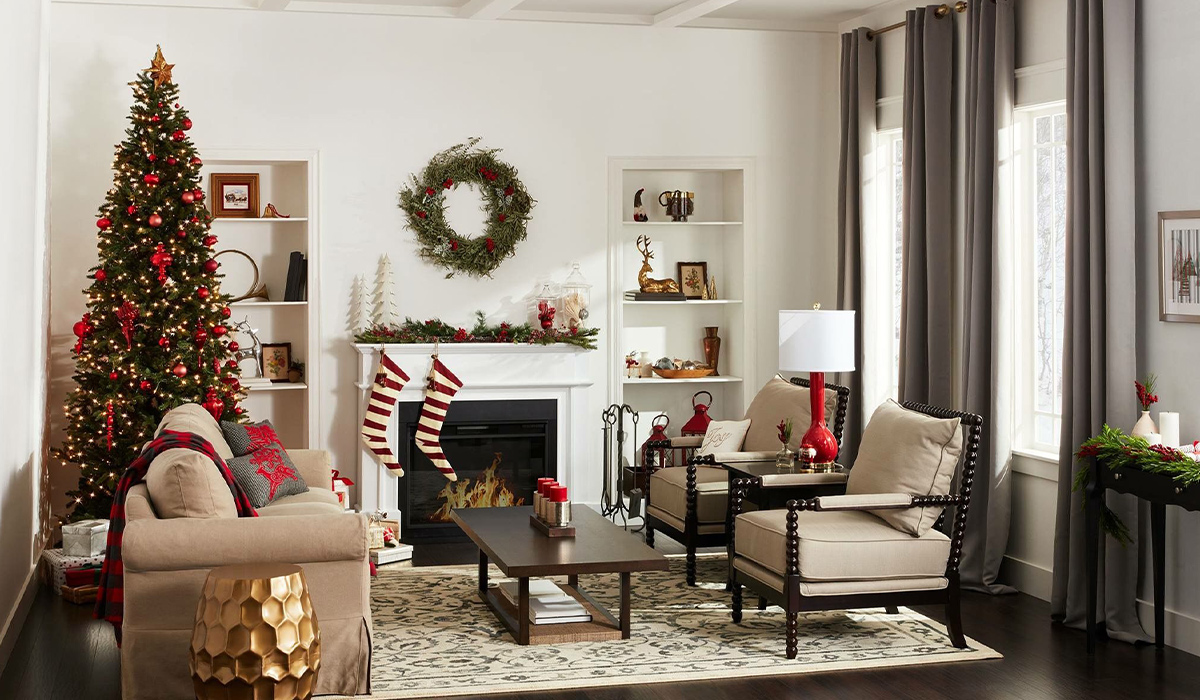 Класична вітальня з новорічним декором поєднує стримані кольори та розкішні деталі інтер’єру. Ламінат Floorpan Prime Harbour FR015 32 клас 4V 8 мм наповнює простір глибиною кольору, що продовжується в темних елементах меблів. Диван DLS Ель темно-бежевий є тихим острівцем теплого затишку та відпочинку. Білизна стін, оздоблених інтер'єрною фарбою латексною Maxima Silk Touch 7 шовковисто-матова 6 кг, контрастує з підлогою та підкреслює красу вмонтованих полиць з ліхтариками, оленями, фігурками декоративними Home&You Dropdeer 59236-SRE-H0050-BN. Над каміном стіну прикрашає вінок новорічний із червоними ягодами BonaDi YE1-013 55 см. В кутку розмістилась струнка ялинка Президентська лита 250 см, прикрашена в червоних барвах, зі золотою верхівкою на ялинку Сніжинка BonaDi 788-994 25 см. Яскраві іграшки на ялинку Підвіс Флоріаль Соффі 8106 10 см та Кулька Флоріаль Соффі 8101 10 см поєднуються з іншими святковими деталями та створюють неповторний настрій кімнати.