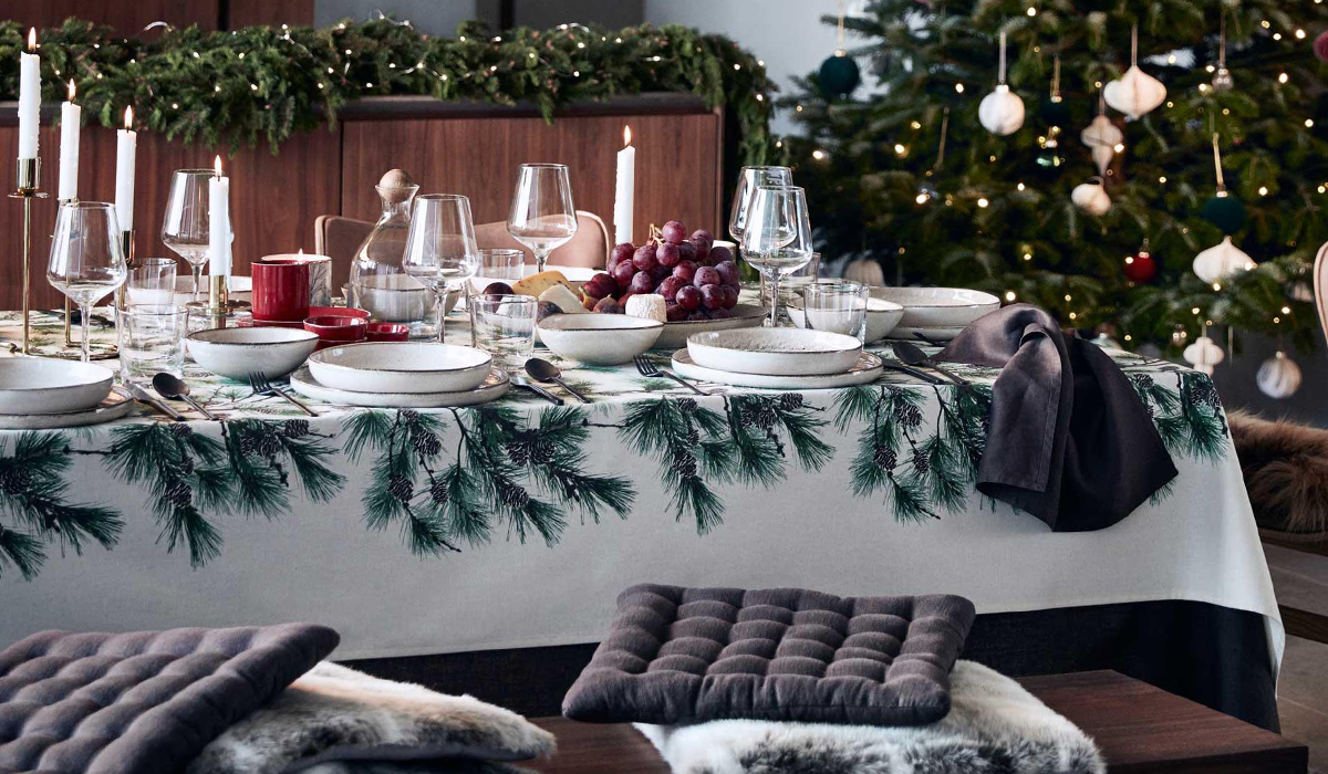 Святковий стіл – це не тільки місце для спільного обіду чи вечері, а й незабутні враження від спільно проведеного часу, веселощів та розмов. Естетика його оформлення додасть особливого настрою господарям та гостям. Світла скатертина із сосновими гілочками вдало гармоніює з пахучим ялиновим декором, прикрашеним гірляндою Elisey Роса 9133-012 100LED 10 м жовтого теплого світла. Білі порцелянові салатники Ardesto Bagheria AR2914WGC Bright white 14 см і тарілки супові Ardesto Bagheria Bright white AR2920WGC 20 см охайно розкладені для кожної особи. Особливого шарму і блиску додають склянки BonaDi Donna 579-242 зі срібним кантом 380 мл та набір келихів для вина Bohemia Corvus 1SC69 360 мл 6 шт. На задньому фоні сяє вогнями ялинка, оздоблена набором ялинкових куль BonaDi 47-102 8 см 12 шт білий гліттер та іграшками на ялинку куля Dashuri 8 см біла.