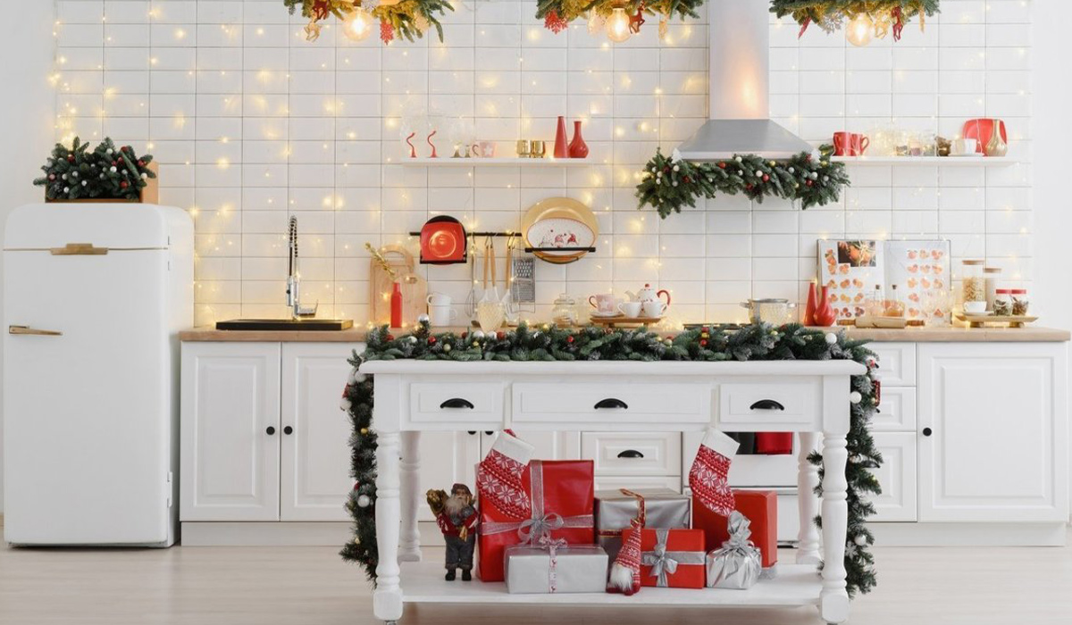 Білосніжна кухня, прикрашена до різдвяних свят, стає казковим раєм господині, де запах солодкої випічки змішується зі свіжим ароматом хвої та наповнює простір відчуттям див і радості. Підлога випромінює гладкість зимової ковзанки з ламінатом Rezult Diamond D220 Дуб каньон гірський 32 клас 8 мм, а глянцева плитка для стін Golden Tile Metrotiles plane 460111 сатин 10*20 см біла творить справжній шедевр в поєднанні з гірляндою святкових вогників. Кухонне начиння виблискує у мерехтливому світлі, серед яких ємність для продуктів Ardesto Golden Moon AR1354BLRG 540 мл. Витяжка Grunhelm GVK 234 I купольна нержавіюча сталь, оздоблена хвойним декором, створює враження чарівного комина, з якого от-от посиплються подарунки. Просторий стіл прикрашає новорічна гірлянда хвойна Ковалівська блакитна лита 2,50 м з набором ялинкових куль білого та червоного кольору. Під ним розмістилася гора подарунків до свят та новорічна іграшка Санта BonaDi NY14-751 30,5 см червона з сірим.